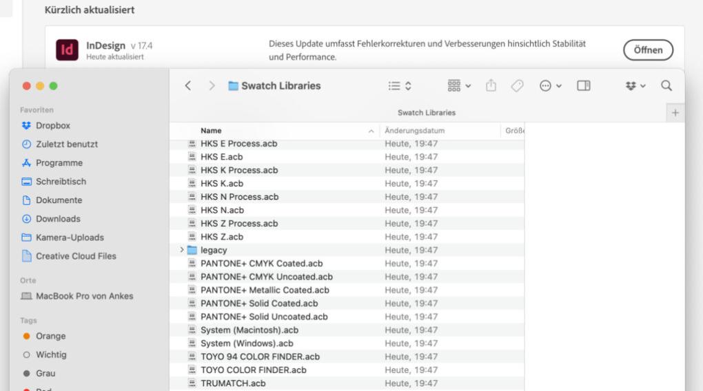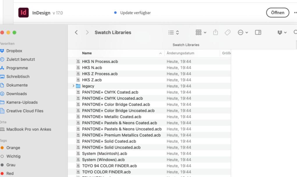 Als Beispiel: In diesem Screenshot siehst du die Bibliotheken, die im Ordner deines InDesign 2022 (Version 17.0) enthalten waren (oder sind). Ich zähle zehn Bibliotheken, unter anderem „Pantone+ Premium Metallics Coated“ und „Pantone+ Pastel & Neon Coated“.