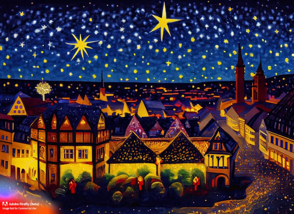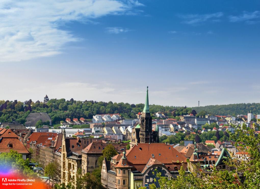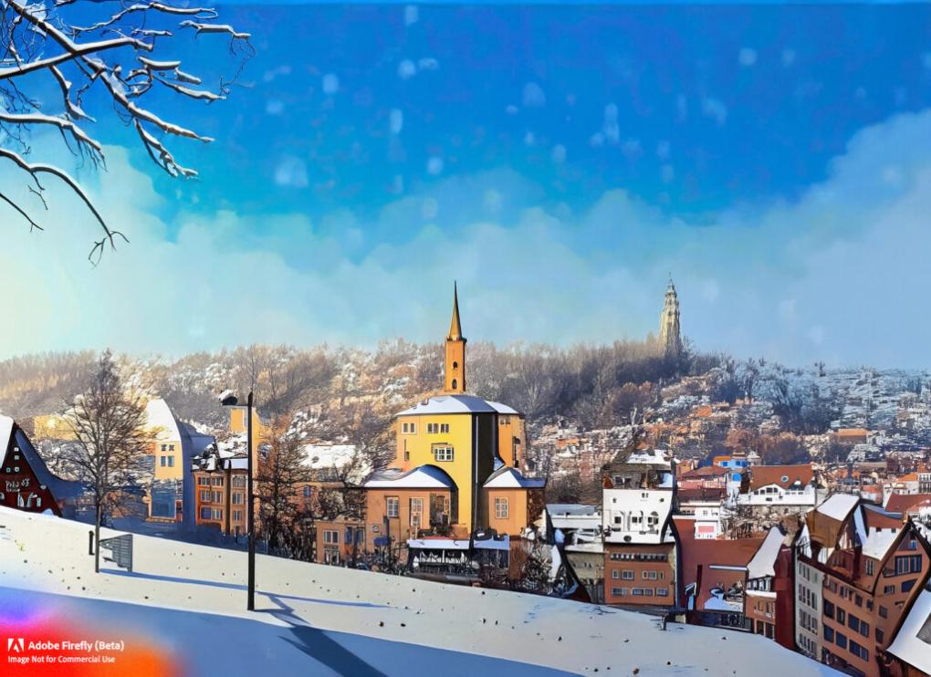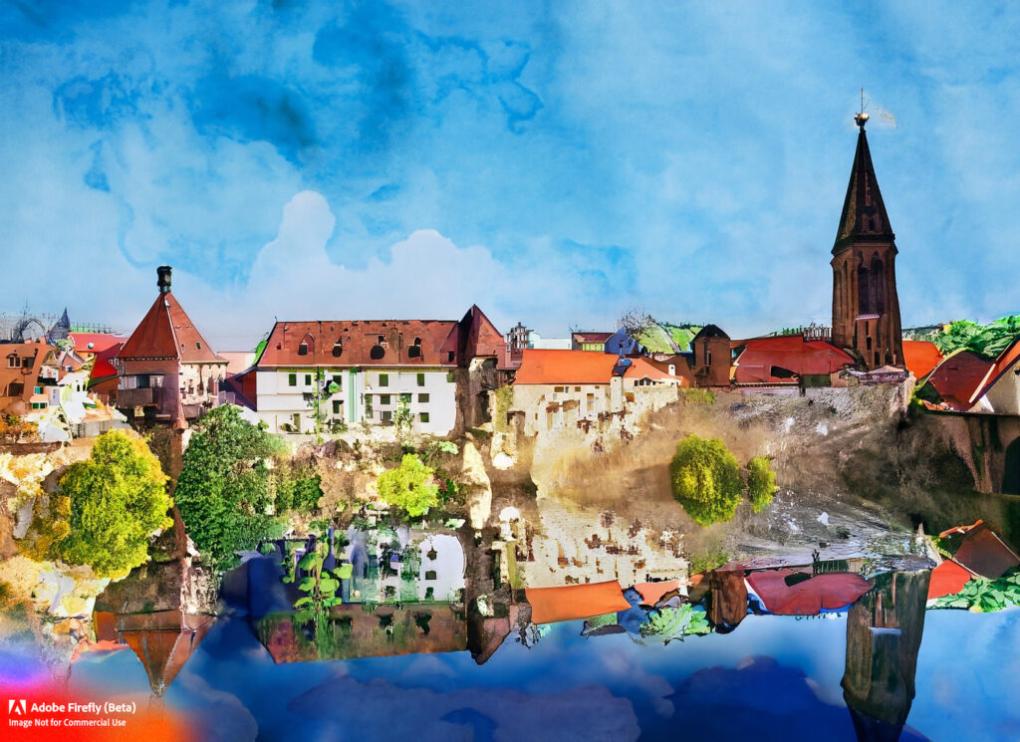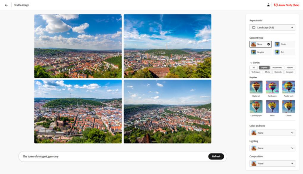 Und so ähnlich funktioniert "Firefly" in diesem Modus auch. In einem "Prompt", also einer Texteingabe, wird das gewünschte Bild beschrieben und die KI bietet eine Interpretation dessen an. Hier sieht man, was sich "Firefly" unter "The town of Stuttgart, Germany" vorstellt.