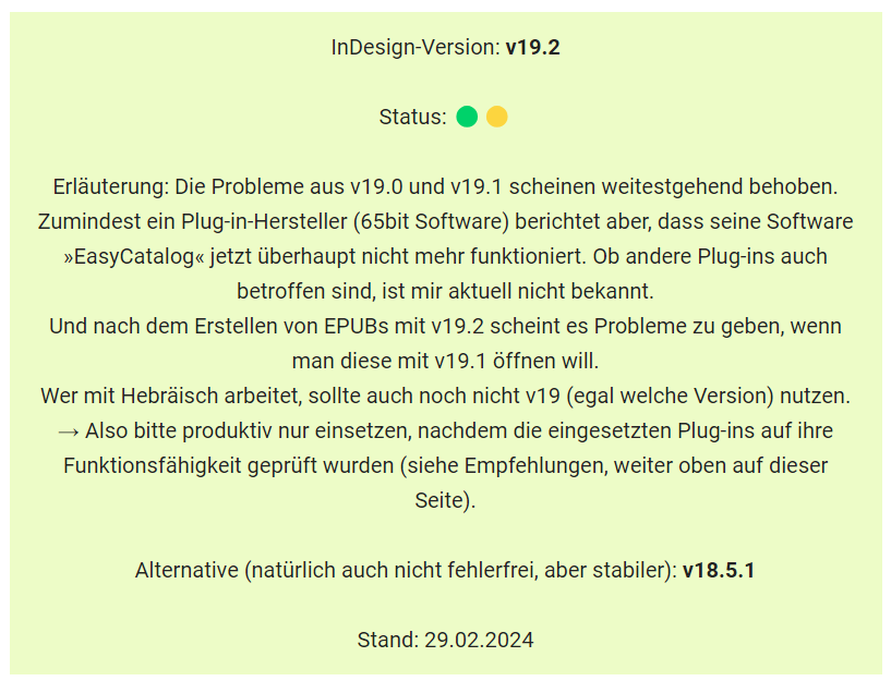 Oder - man nutzt den kostenlosen Service der website indesign-status.de. Hinter dieser Website steckt ein kluger Kopf, nämlich Rainer Klute. Er ist Grafik- , Web- und Logodesigner, schult InDesign und hilft in seiner https://indesign-sprechstunde.de direkt bei Fragen zu InDesign. Zudem leitet er die IDUG-Hamburg.