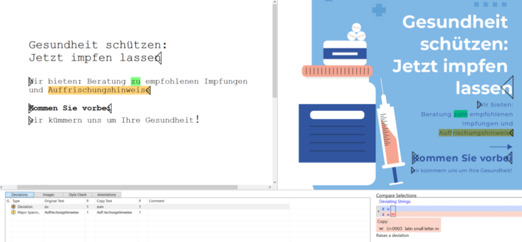 Wenn wir an Publikationen für Pharmaunternehmen arbeiten, stehen wir vor einer Herausforderung: Es muss garantiert sein, dass keinerlei Abweichungen zwischen den Originaldokumenten und den veröffentlichten Dokumenten entstehen. Fehler in Dosierungshinweisen, Nebenwirkungslisten oder Packungsangaben? Ein absolutes No-Go. TVT hilft uns dabei, diese Abweichungen zu erkennen und zu dokumentieren.