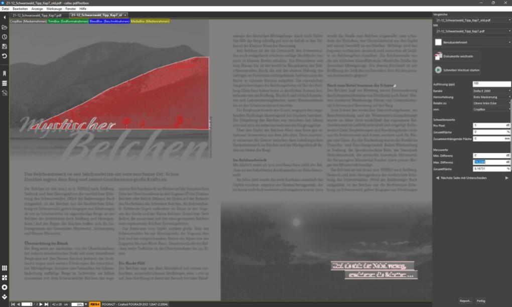 Zum einen die kleine Markierung oben rechts, die auf den Schreibfehler "Schattex" hinweist. Dann oben links die Markierung, die darauf hinweist, dass eine Farbkorrektur im Bild vorgenommen wurde. Auch so etwas kann die pdfToolbox erkennen. Unten rechts wird darauf hingewiesen, dass der Störer leicht verschoben wurde.
