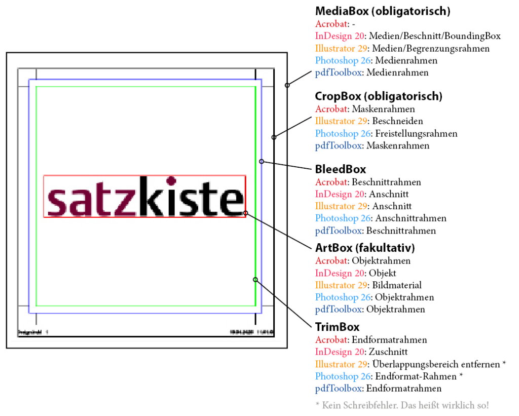 Bei der Bearbeitung von PDFs kommt es bei mir immer wieder zu Unsicherheiten bezüglich der Rahmen, die ein PDF hat. Diese haben nämlich in verschiedenen Programmen unterschiedliche Namen. Ich meine die Rahmen, die in der PDF-Spezifikation MediaBox, CropBox, BleedBox, ArtBox und TrimBox heißen.
