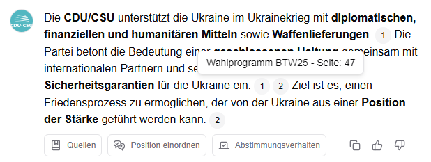 Bemerkenswert ist dabei, dass in den Antworten der KI immer die Quellen genannt werden, aufgrund derer die Aussage von Wahl.chat getroffen wird. So kann man im Zweifelsfall nachlesen, ob die Zusammenfassung stimmt.
