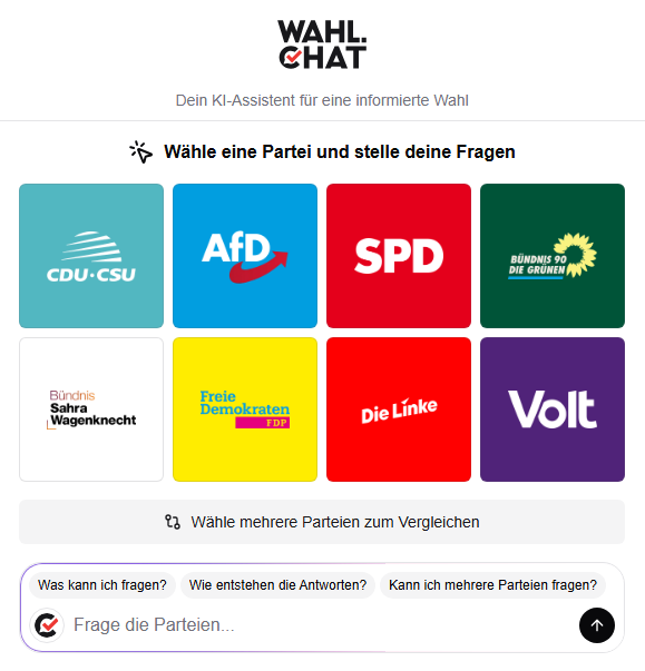 Wahl.chat ist eine tolle KI-unterstützte Hilfe bei der Wahlentscheidung. Zugegeben - muss man etwas mehr Zeit investieren als für den Wahl-O-Mat, weil man sich selbst seine wichtigen Themen aussuchen und entsprechende Fragen formulieren muss.