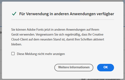Schon 2023 änderte Adobe eine Klitzekleinigkeit bei "Adobe Fonts" über die wir aber jetzt doch mal berichten wollen. Denn es gibt beim Installieren von Schriften mit "Adobe Fonts" (früher bekannt als "TypeKit") einen Unterschied. Es gibt nun die Möglichkeit Schriften "in Adobe-Applikationen" zu nutzen oder in "In Adobe- und anderen lokalen Applikationen".