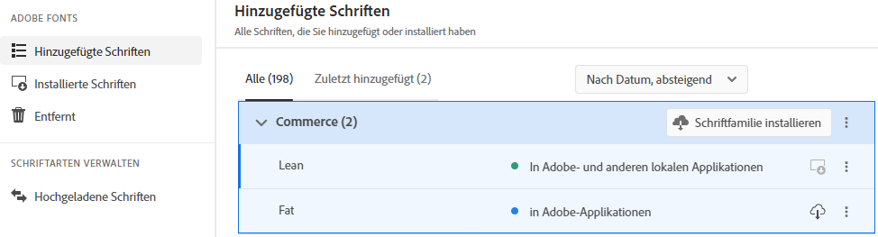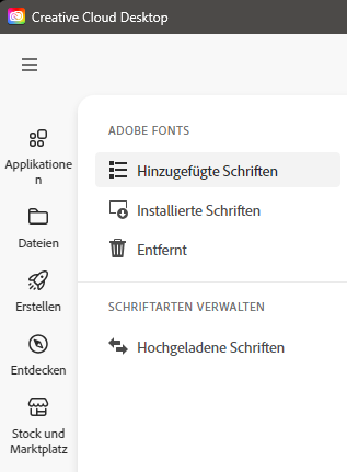 Wenn Du in diesem Programm in den Bereich der "Adobe Fonts" gehst, durch Klick auf das kleine geschwungene "f" oben rechts, kannst Du zwischen vier verschiedenen "Geschmacksrichtungen" wählen: "Hinzugefügte Schriften", "Installierte Schriften", "Entfernt" und "Hochgeladene Schriften".