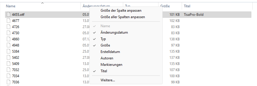 🪟 Kopiere diese Dateien an einen anderen Ort und benenne sie um durch Hinzufügen der Dateierweiterung ".otf". Wenn Du jetzt die Spalte "Titel" einblendest, kannst Du den eigentlichen Schriftnamen ablesen.