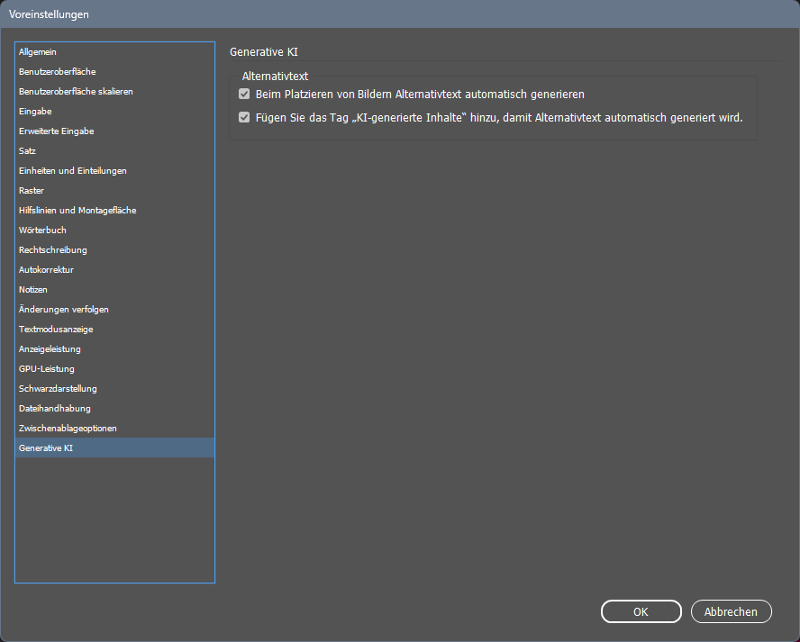 In den Voreinstellungen im Bereich "Generative KI" stehen zwei relevante Optionen zur Auswahl: